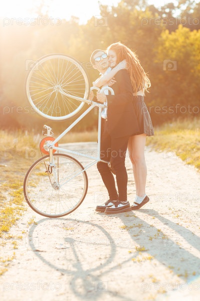 Молодой стильный парень с девушкой и велосипедом на свежем воздухе