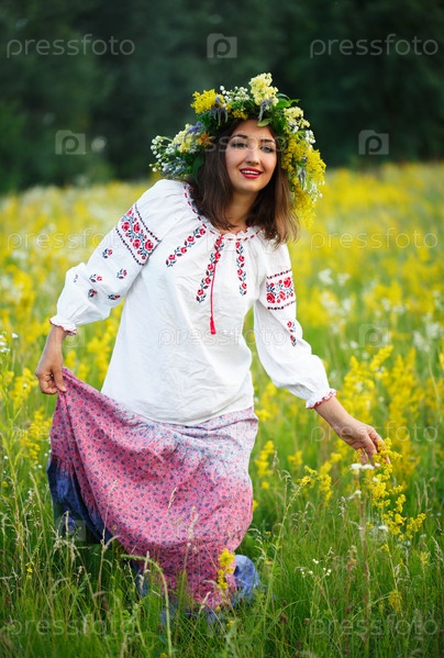 Улыбающаяся девушка в украинском костюме с венком на голове