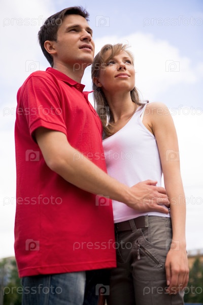 Фото счастливой пары, смотрящей в сторону во время проведения времени на свежем воздухе