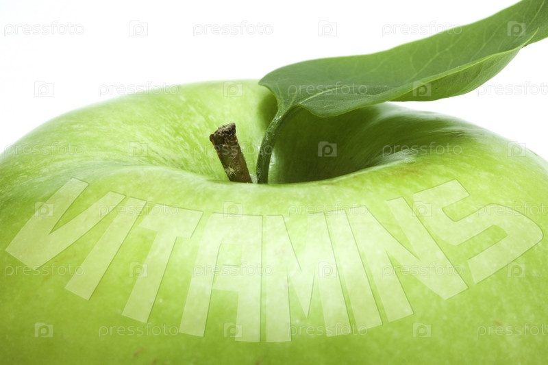 Зеленое яблоко с надписью "Витамины" по-английски на белом фоне