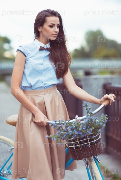 Красивая, элегантно одетая женщина с велосипедом