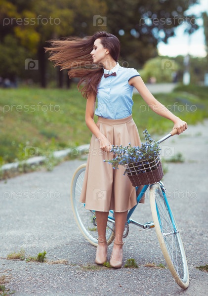 Красивая, элегантно одетая женщина с велосипедом