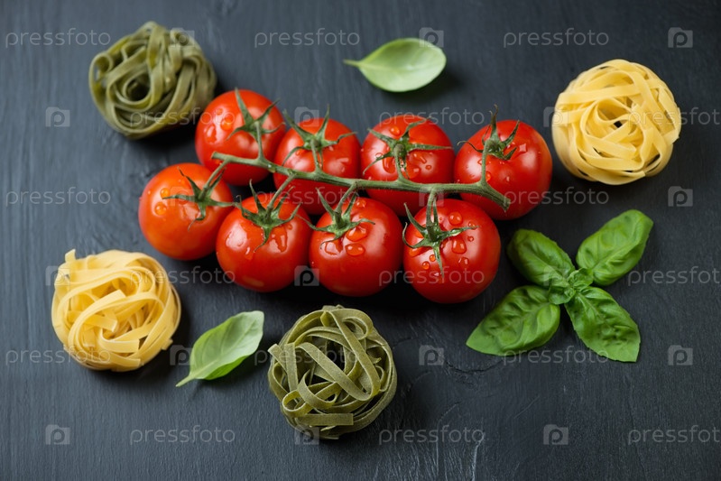 Красные помидоры, цветные тальятелле и базилик