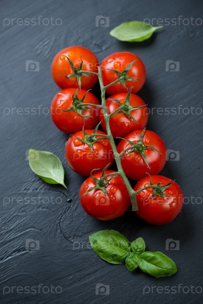 Спелые красные помидоры и зеленый базилик