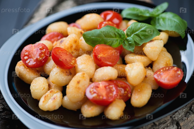 Жареные ньокки с помидорами черри и зеленым базиликом