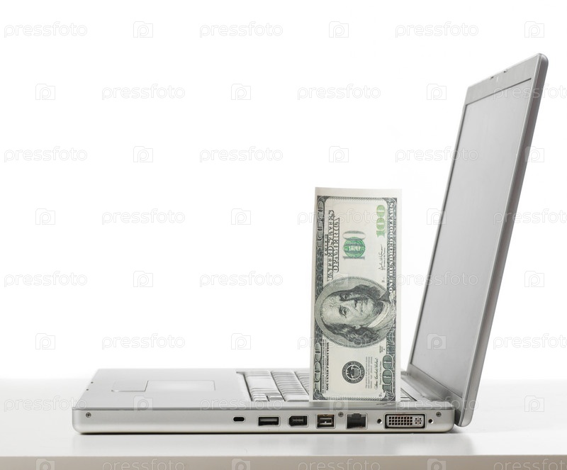 Серебристый ноутбук и долларовая банкнота на столе на белом фоне