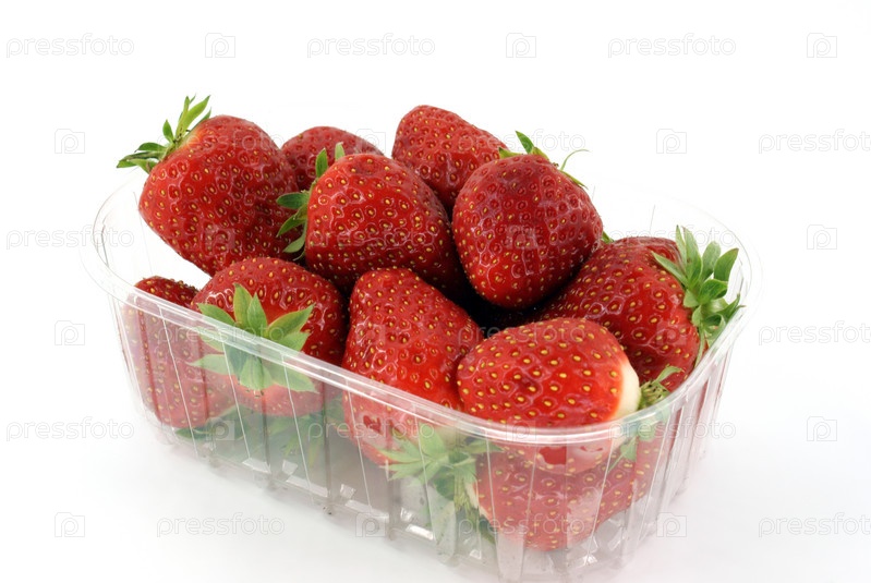 Зрелые клубники в пластиковой тарелке на белом фоне