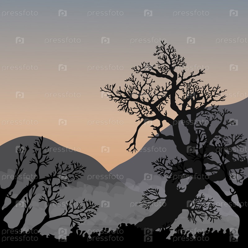 Силуэты деревьев и холмов, утро