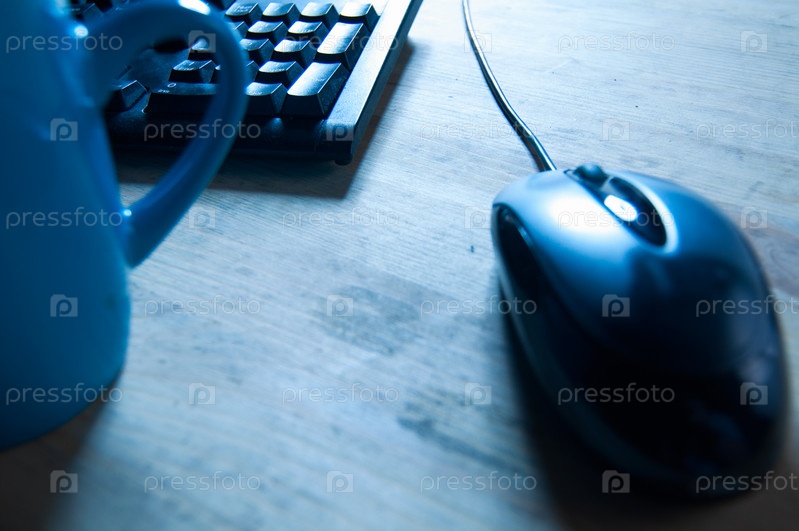 Компьютерная мышь, клавиатура и кружка на столе