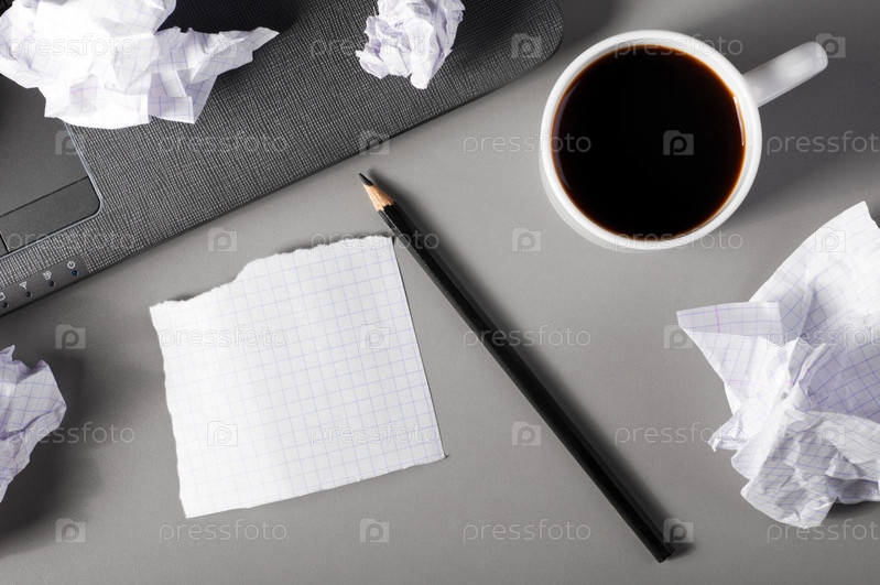Ноутбук, карандаш, кружка с кофе и смятые листы бумаги на столе