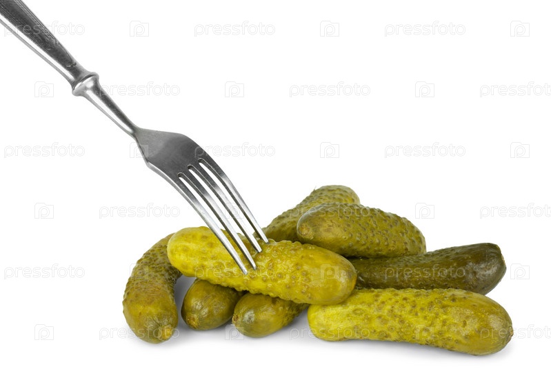 Маринованные огурчики и вилка на белом фоне