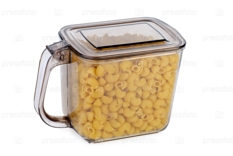 Кухонный контейнер для сыпучих продуктов с макаронами. Белый фон