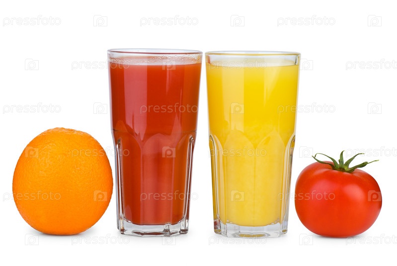 Помидор, апельсин и стаканы с соком на белом фоне