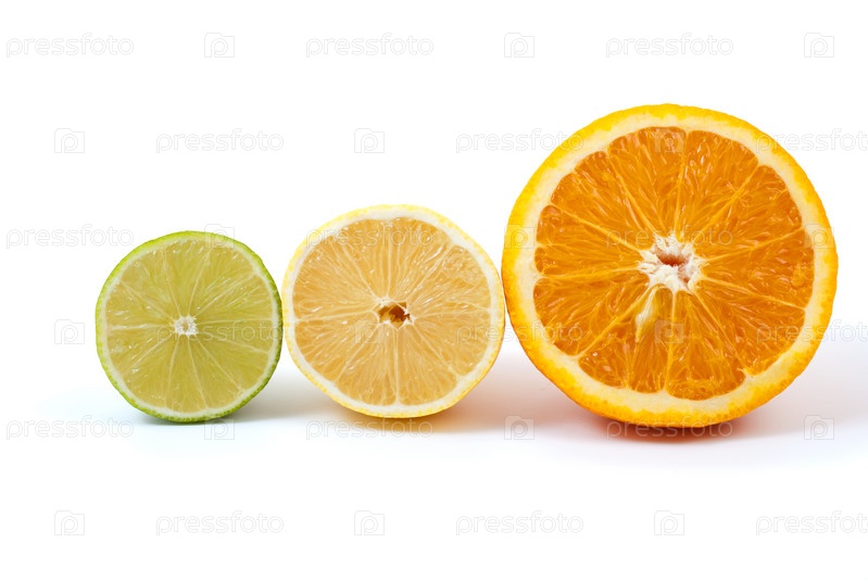 Половинки апельсина, лимона и лайма на белом фоне