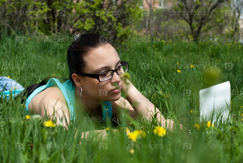 Красивая девушка с ноутбуком на природе