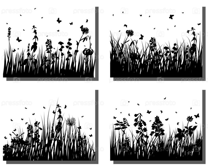 Силуэты травы и бабочек. Набор векторных изображений. Все объекты разделены