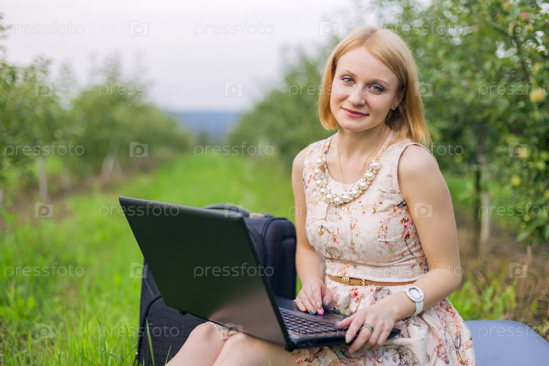 Девушка с ноутбуком на природе
