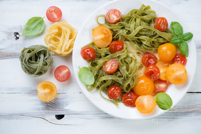 Цветные тальятелле с обжаренными помидорами и базиликом
