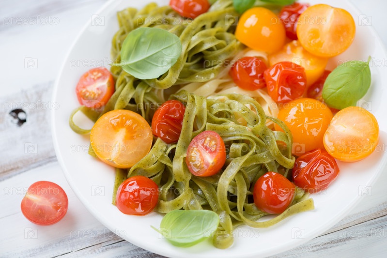 Цветные тальятелле с обжаренными помидорами и базиликом