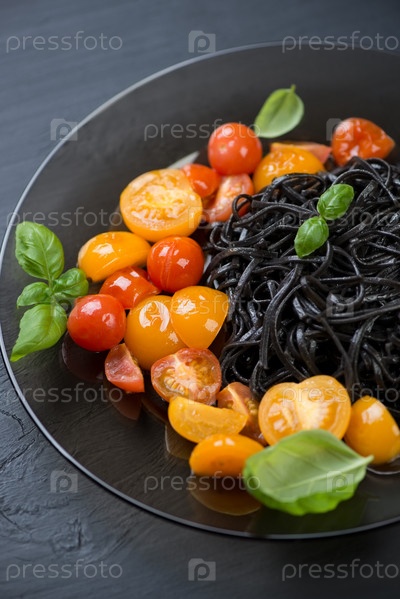 Черные тальятелле с обжаренными помидорами и базиликом