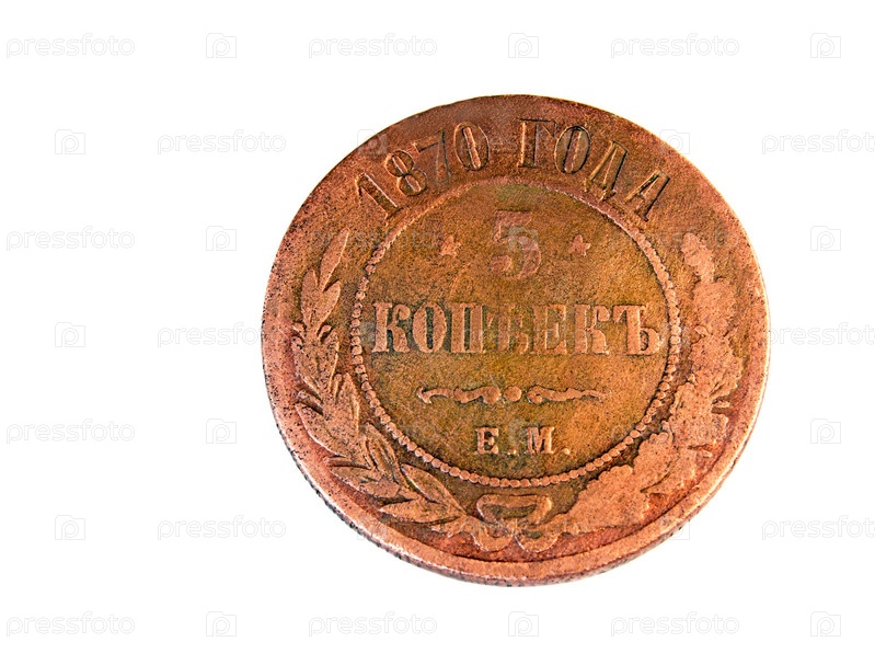 Старая российская медная монета на белом фоне