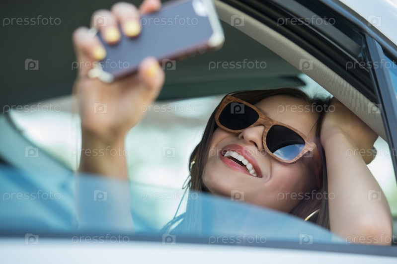 Девушка фотографируется в автомобиле