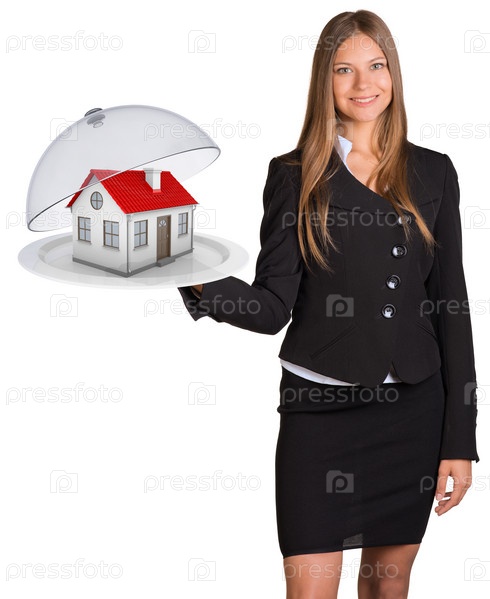 Деловая женщина держит тарелку с домиком