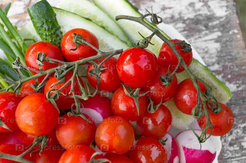 Тарелка с помидорами черри, огурцами, перцем