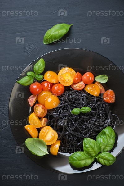 Черные тальятелле с обжаренными помидорами и базиликом