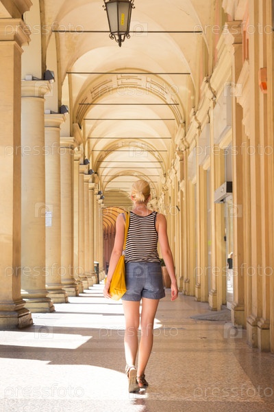 Женщина идет по улице Болоньи, Италия