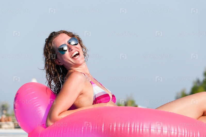 Счастливая молодая женщина в бассейне на розовом надувном круге