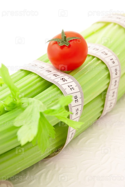 Сельдерей и помидор с сантиметровой лентой на белом фоне