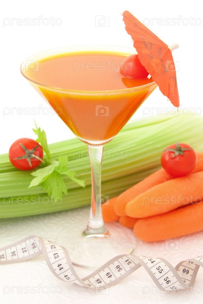 Овощной коктейль и овощи с сантиметровой лентой на белом фоне