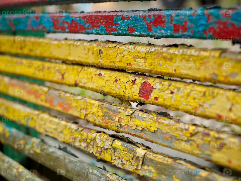 Старая скамейка с облупившейся краской крупным планом