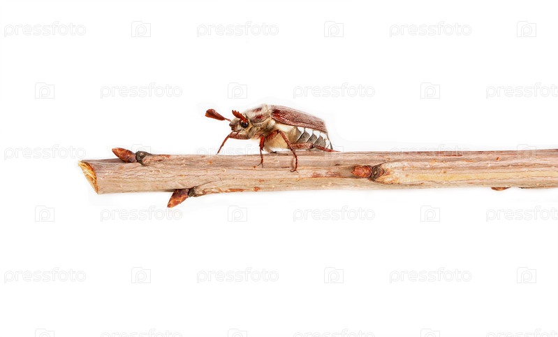Майский хрущ сидит на ветке на белом фоне
