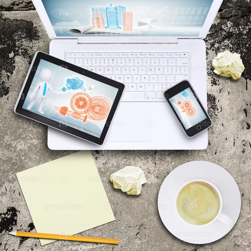 Ноутбук, смартфон, планшет и чашка кофе