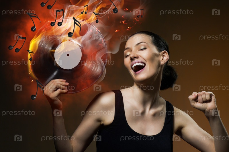 Девушка с горящей пластинкой наслаждается музыкой