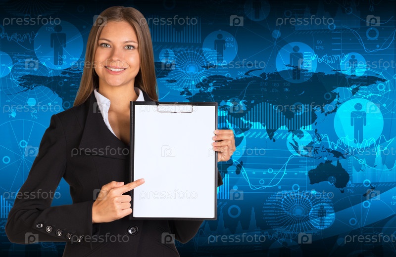Бизнес-леди с планшетом, удерживая держатель бумаги