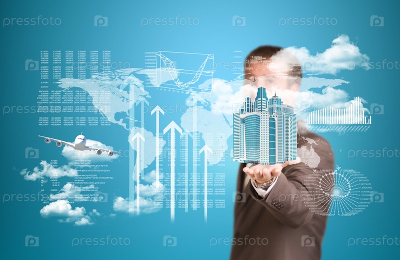 Карта мира, небоскребы и самолет