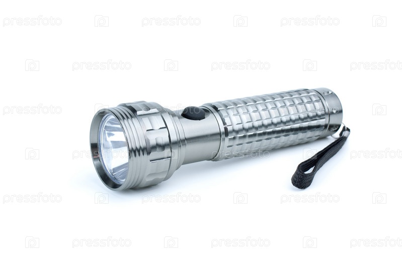 Металлический серебристый фонарик на белом фоне