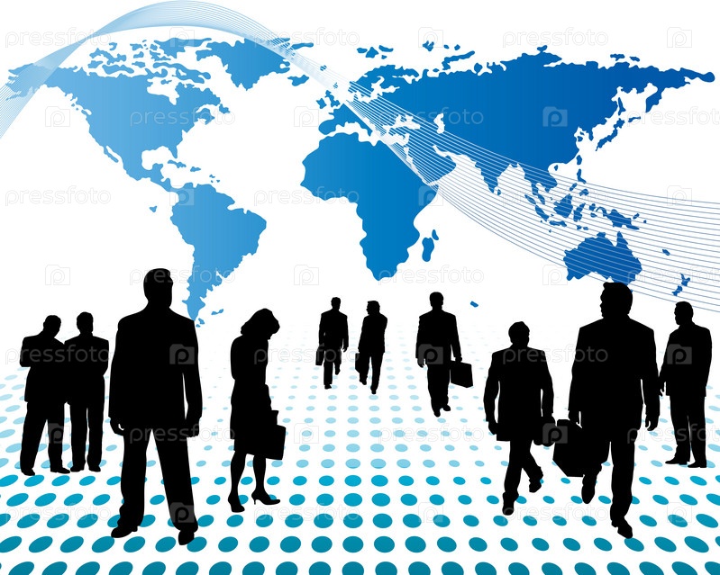 Бизнесмены на фоне карты мира. Метафора международного бизнеса
