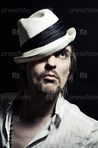 Портрет молодого человека в белой шляпе, на черном фоне, крупным планом