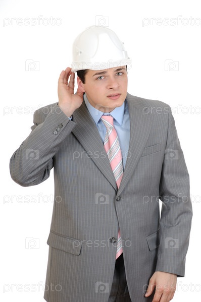 Инженер держит руку рядом с ухом, изолированной на белом фоне
