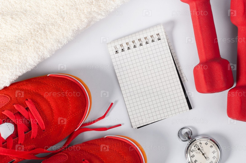 Гантели, кроссовки, секундомер и блокнот на белом фоне