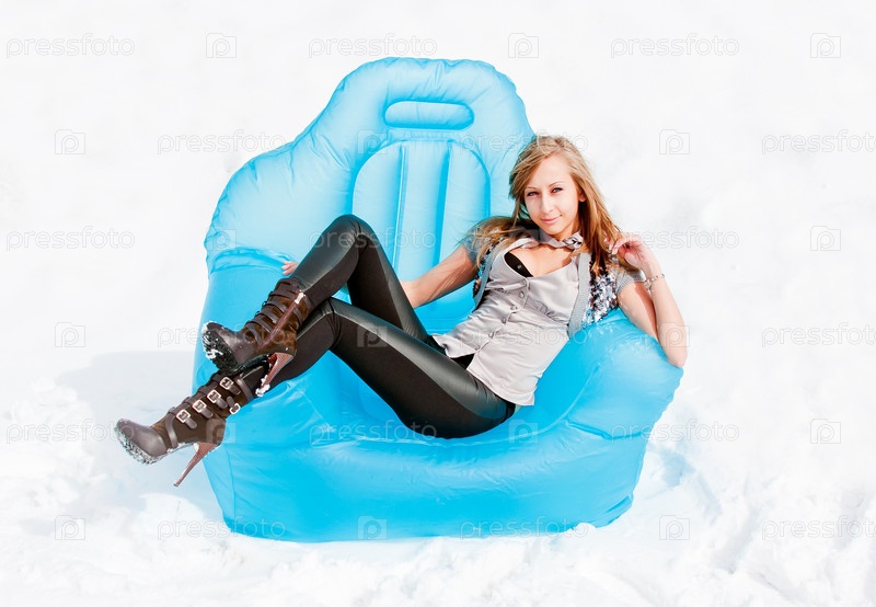 Молодая женщина сидит в кресле на снегу