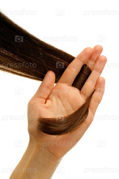Замок шёлково-коричневого волоса в руке изолирован на белом фоне