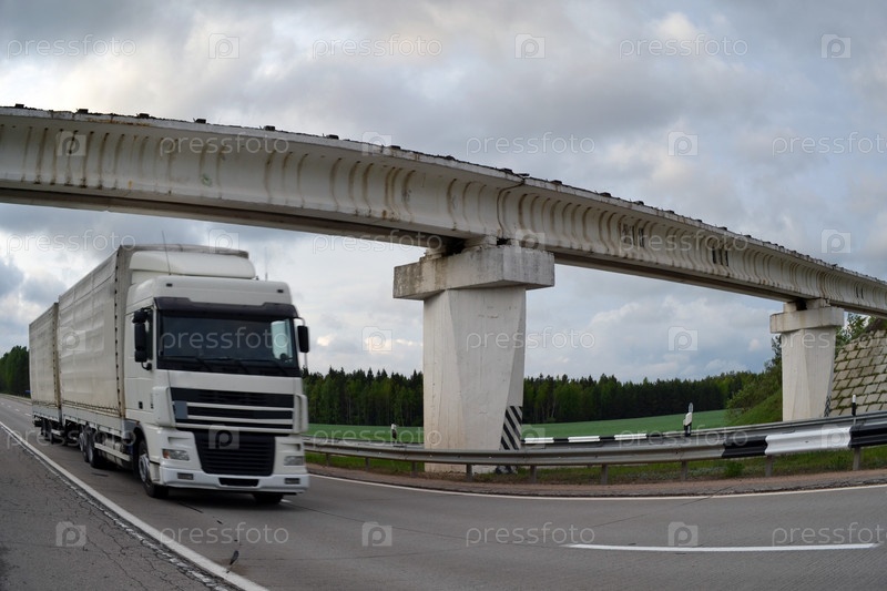 Грузовик едет под мостом