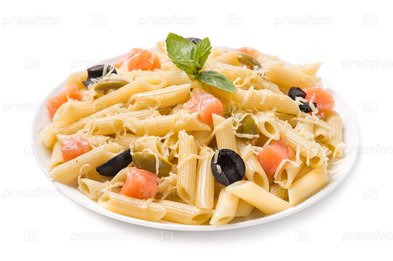Итальянская паста с копченым лососем на белом фоне