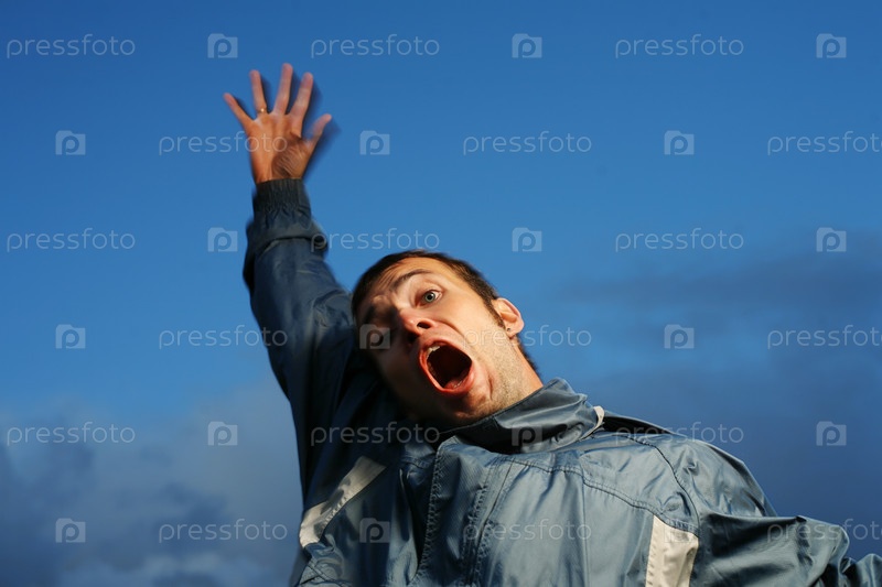 Кричащий молодой человек на фоне вечернего неба