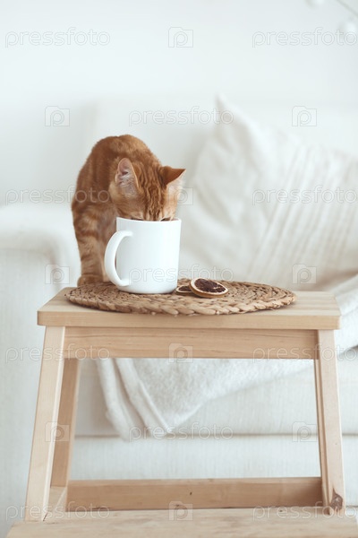 Кошка пьет из кружки